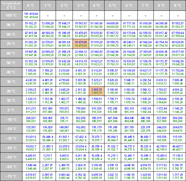 Dans la pratique cette modélisation est extrapolée en dehors de son domaine de définition. Le modèle employé est testé par comparaison avec des valeurs de référence prises dans la référence [4]. Les résultats sont présentés au paragraphe 3.1.1 dans le tableau 4 entre -70 °C et 100 °C. Il n´y a pas d´écart constaté.