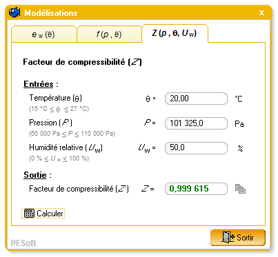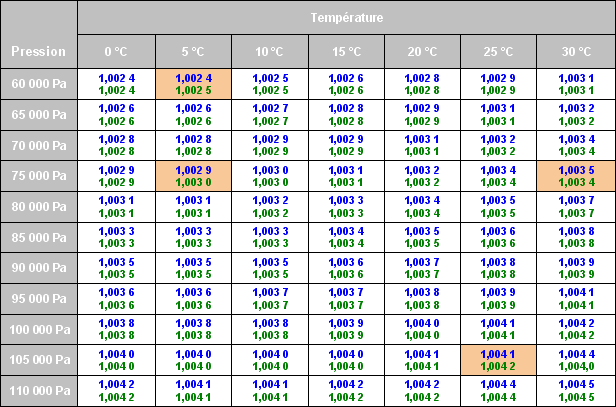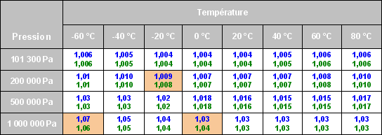 Une série de 77 valeurs du facteur d´augmentation pour des températures comprises entre 0 °C et 30 °C variant avec un pas de 5 °C et des pressions variant entre 60 000 Pa et 110 000 Pa avec un pas de 5 000 Pa ont été comparées entre :
