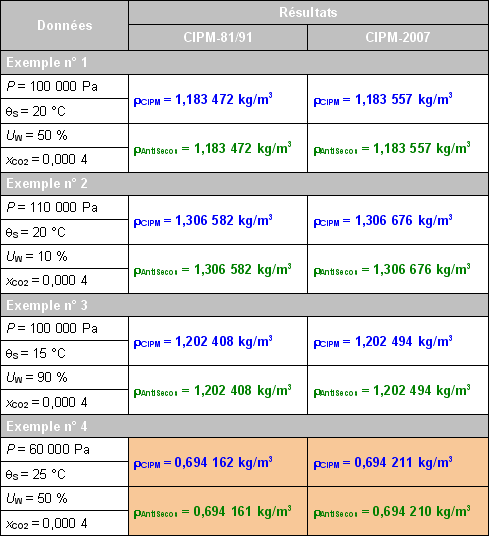 Concernant la formule CIPM-81/91, les données de référence sont extraites de [6]. S'agissant de la formule CIPM-2007, au moment de la rédaction de ce dossier il n'existait pas de jeux de données de référence permettant de tester les calculs. Ce point est manquant et aurait dû être inclus dans les publications présentant la formule CIPM-2007, comme cela avait été fait pour les formules précédentes. Un jeu de données a donc été calculé directement avec le logiciel PFS-AC [13]. L'équation correspondante peut être téléchargée dans le lien suivant (décompresser l'archive zip dans le répertoire de l'application PFS-AC) :