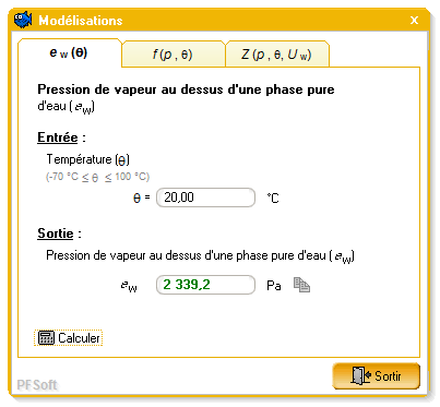 La pression de vapeur saturante au dessus de l´eau en phase pure ew, exprimée en pascals, est calculée entre 223,15 K et 373,15 K (-50 °C et 100 °C) par la relation suivante qui est issue de la référence [3] :