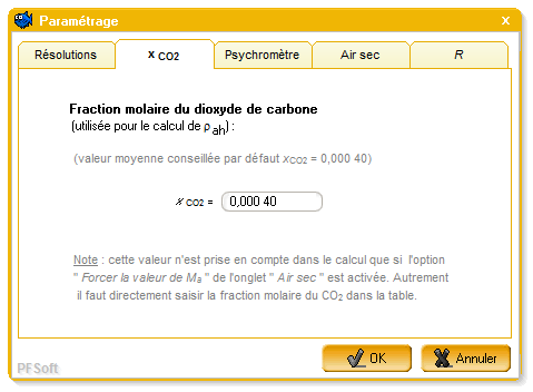 Les différents constituants de l'air sec, leur masse molaire et leur fraction molaire sont enregistrés pour le calcul de Ma. En cliquant sur « valeurs par défaut », le logiciel propose de charger les valeurs de la formule CIPM-2007 [2] ou à des fins historiques les valeurs de la formule CIPM-81/91 ([6], [8]). Il est également possible de modifier les valeurs des masses molaires ou des fractions molaires en double cliquant sur les cellules du tableau. Toutefois comme le précise le paragraphe 1.1, les valeurs de Ma calculées à partir des constituants ou figurant dans les formules du CIPM sont légèrement différentes, en raison d'arrondis. Afin d'assurer une compatibilité avec les formules du CIPM, le logiciel AntiSecos propose de forcer les valeurs de Ma à :