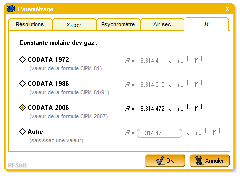 Cette constante est déterminée régulièrement par différentes équipes de recherche et les valeurs retenues sont publiées dans le cadre du Codata. Le logiciel AntiSecos permet de choisir les valeurs de la constante molaire des gaz qui ont été utilisées dans le cadre des formules du CIPM ou de définir toute autre valeur comme indiqué sur la figure 10.