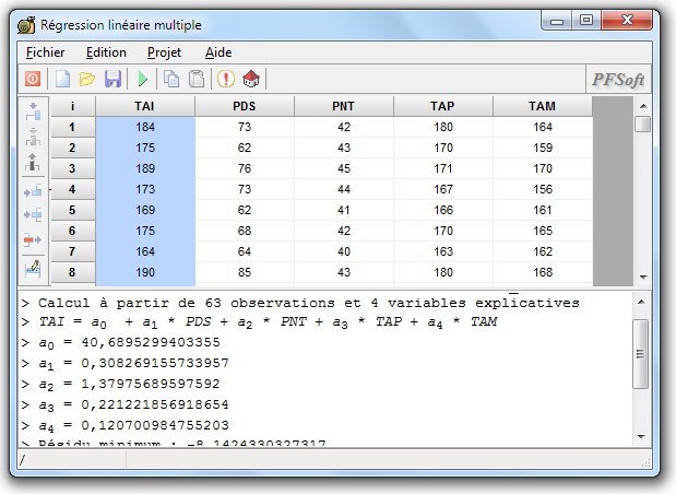 Supposons que l'on veuille étudier la relation entre les caractères physiques de la population, et plus précisément qu l'on souhaite déterminer la taille d'un individu à partir d'autres caractéristiques morphologiques de l'individu et de ses parents. Pour cela on utilise les données du tableau 1 qui donne la taille TAI, le poids PDS et la pointure PNT d'un groupe de jeunes appelés au service national. Le tableau donne pour chaque individu les mêmes caractéristiques de sont père et de sa mère : TAP et TAM pour les tailles du père et de la mère ; PDP et PDM pour les masses ; PTP et PTM pour les pointures.