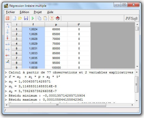 Les valeurs de a0, a1, a2, a3 et a4 sont déterminées à partir du logiciel RLM comme indiqué sur la figure 1 (le fichier ayant servi au calcul est fourni avec le logiciel sous le nom « données réduites.rlm »). On trouve le système :